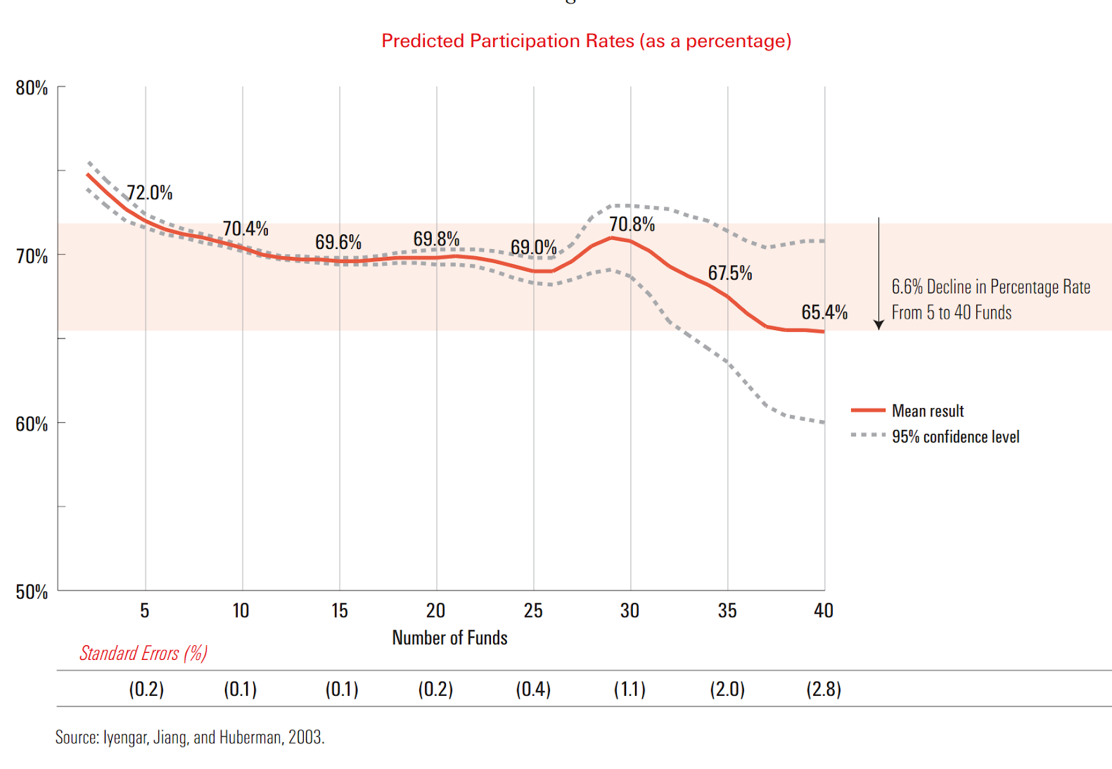 As per the diagram above, for every 10 funds added to the array of options, the rate of participation drops by 2 percent. In fact, for those employees who chose to invest, adding more investment choices increased the chances that employees would invest in more conservative funds.