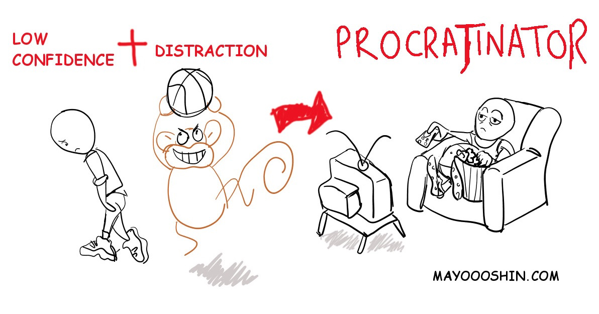Let’s move onto the lower half of the equation— distractions and time delays, as shown by the annoying and irritating monkey looking for instant gratification.
