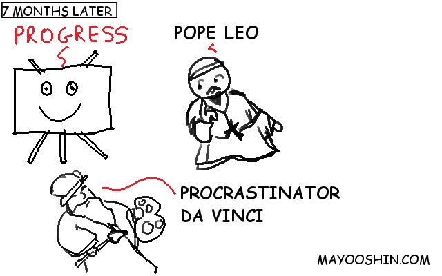 1. The stories of Leonardo Da Vinci’s chronic procrastination have been well documented especially noted by 16th Century Novelist and writer Matteo Bandello, though I use these characters in my own storytelling format.