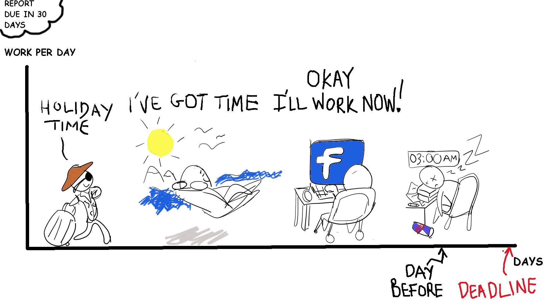 For example, when I was in University, I would usually have a couple of months leading up till the deadline of a major research paper. Instead of starting the work on time, I would spend these months socializing, travelling and watching my favourite TV shows.